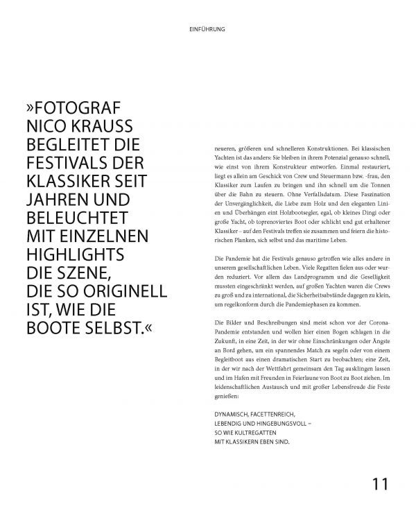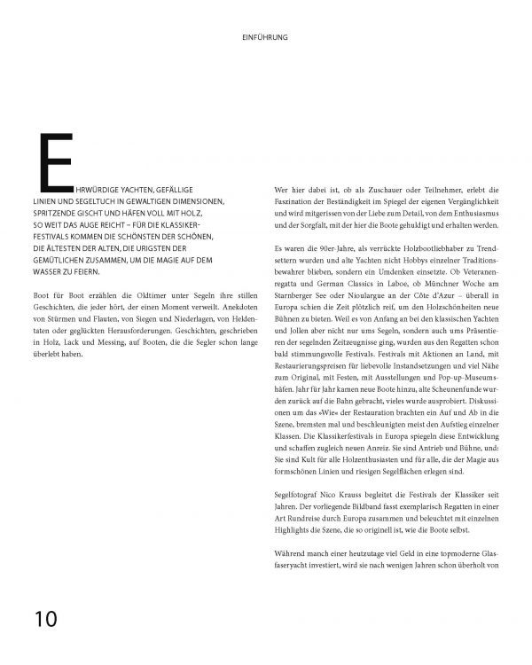 Fotograf Nico Krauss hat das Besondere dieser Segelevents mit der Kamera eingefangen. Im Spiel mit Licht und Perspektiven schafft er actionreiche Panoramen ebenso wie überraschende Detailaufnahmen und macht damit den individuellen Charme jeder einzelnen Regatta erlebbar. Eine visuelle Hommage an das Regattasegeln und die großen Segelklassiker!