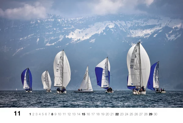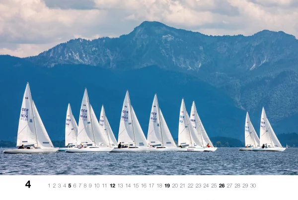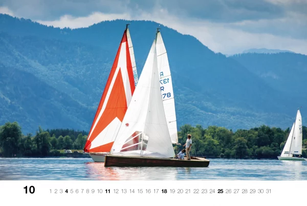 Fotokalender für 2025 mit stimmungsvollen Aufnahmen von Segelyachten machen ein ganzes Jahr lang Lust auf See – vor Alpenkulisse.
