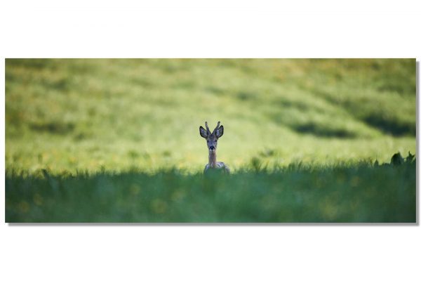 Im satten Frühlingsgrün sitzt ein Rehkids im Feld von Ekenis in Schleswig-Holstein und horcht ganz aufmerksam, ob die Luft rein ist.