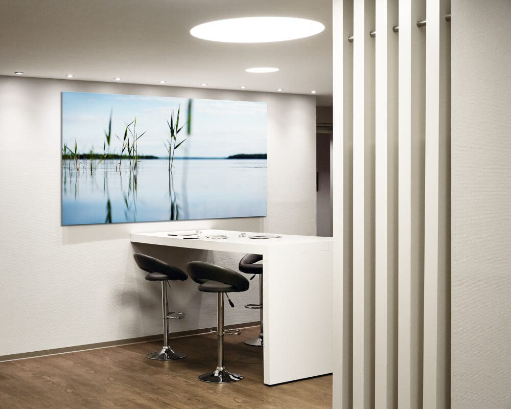 Unsere Intention: Jeder Arbeits- und Lebensbereich bekommt seine eigene Bildsprache. Fokussierung und Klarheit im Konferenzzimmer, richtungsweisend im Flur und Wärme und Geborgenheit z.B. im Wartebereich. Der visuellen Gestaltung sind keine Grenzen gesetzt.